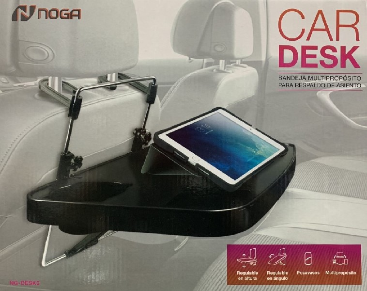 Bandeja multiproposito para auto, sirve para poner en el volante o asiento trasero - Diseño liviano y resistente - Regulable en altura y ángulo - Ganchos de sujeción - Perillas de ajuste - Portavasos - Grosor de 4 cm. en posición totalmente horizontal - Soporta hasta 10 kg. - Dimensiones: 35,5 x 23,5 cm.